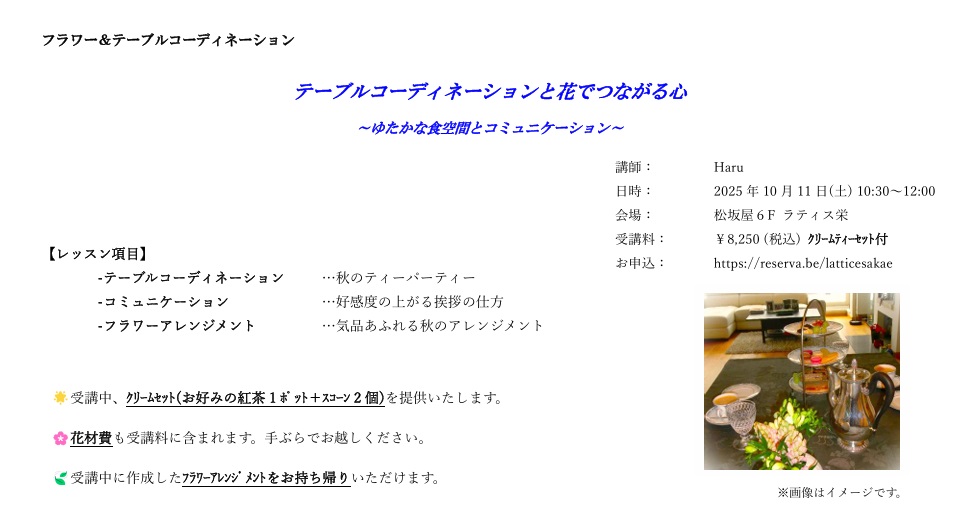 ≪フラワー&テーブル コーディネーション, 10/11Sat≫ ≪大人の魅力を引き出す, 10/23Thu≫
